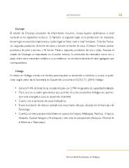 ANTECEDENTES 25 Durango El estado de Durango poseedor de importantes recursos, ocupa lugares signifcativos a nivel nacional en los siguientes sectores: 1) Agrícola: el segundo lugar en la producción de manzana, tercer lugar en avena forrajera seca y cuarto lugar en frijol, nuez y maíz forrajero; 2) Sector Pecua- rio: segundo productor de leche de cabra y tercero en leche de vaca; 3) Sector Forestal: primer productor de pino y encino; y 4) Sector Minero: segundo productor de oro y plata. Aunque el estado de Durango es importante en el sector minero, la extracción de minerales como oro y plata, entre otros minerales metálicos y no metálicos, no recibe localmente el valor agregado que correspondiera. Hidalgo El estado de Hidalgo cuenta con medios para impulsar su desarrollo económico y social, en parti- cular, según datos de la Secretaría de Desarrollo Económico (SEDECO, 2004) Hidalgo: • Genera 9.4% del total de la energía del país con 2,900 megavatios de capacidad instalada. • Tiene acceso a cuatro gasoductos que permite al sector productivo hidalguense aprove- char este energético para su desarrollo industrial. • Cuenta con importante recursos hidráulicos. • Posee la estación de rastreo satelital más importante del país, ubicada en el municipio de Tulancingo. • Cuenta con siete parques industriales en operación (Tepeji, Atitalaquia, Pachuca, Tizayuca, Huejutla, Ciudad Sahagún y Huichapan) y tres más en prospección (Actopan, Mineral de la Reforma y Tulancingo). Universidad Autónoma de Chiapas