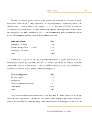 marco teórico 61 También se analizó la edad y estudios de los gerentes de las empresas, en donde se mani- festó que las Gerencias de Durango están ocupadas mayoritariamente por personas jóvenes o de mediana edad. La edad mediana del director-gerente es de 47 años y en un 25% de las empresas no supera los 40 años de edad. La relativa juventud de la gerencia es congruente con el dinamis- mo demográfco del tejido empresarial, ya apuntado anteriormente, pues recordemos que un 40.6% de la empresas han sido fundadas en los últimos diez años. Edad del Gerente (%) Jóvenes (≤ 40 años) 29.8 Mediana edad (>40 y ≤ 55 años) 45.9 Maduros (> 55 años) 24.3 Total 100.0 y dentro de lo que son los estudios, la profesionalización en la gestión de la empresa, re- forzando la formación del estamento directivo, se muestra como factor de fortaleza del tejido empresarial y pone de manifesto que el esfuerzo social educativo se ha traducido positivamente en la incorporación de nuevas generaciones mejor preparadas. Estudios del gerente (%) Estudios básicos 12.8 Bachillerato 13.9 Técnico superior universitario 7.2 Licenciatura 66.1 Total 100.0 Otra caracterización importante el tamaño de la empresa, el Censo Económico 2004 que realizó el INEGI proporcionó la distribución por tamaños de las empresas que constituyen el con- junto de las actividades del sector privado y paraestatal del estado de Durango en el año 2003. El Universidad Autónoma de Chiapas
