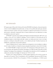 71 METODOLOGíA El Programa para el Desarrollo Profesional Docente (PRODEP) está dirigido a elevar permanente- mente el nivel de habilitación del profesorado, con base en los perfles adecuados para cada sub- sistema de educación superior. Busca que al impulsar la superación permanente en los procesos de formación, dedicación y desempeño de los Cuerpos Académicos de las Instituciones, se eleve la calidad de la educación superior. El PRODEP responde a los propósitos del Programa Sectorial de Educación 2007-2012, que establece como uno de sus objetivos estratégicos: Elevar la calidad de la educación para que los estudiantes mejoren su nivel de logro educativo, cuenten con medios para tener acceso a un mayor bienestar y contribuyan al desarrollo nacional, y como objetivo particular: Fortalecer los procesos de habilitación y mejoramiento del personal académico. Apoya el fortalecimiento de Cuerpos Académicos, la integración de redes temáticas de colabora- ción de Cuerpos Académicos, incluyendo el apoyo para gastos de publicación y becas Post-Doctorales. En el 2007 PRODEP se dirigió al personal de 129 Instituciones de Educación Superior; con la incorporación del subsistema de institutos tecnológicos en 2008, Escuelas Normales en 2009, Institutos Tecnológicos Descentralizados y Universidades Interculturales en 2010, la población de instituciones adscritas en las Reglas de Operación de 2010 es de 568. Respecto a los Cuerpos Académicos, en 2003 estaban registrados 2,971 (91% con grado de desarrollo en Formación, 7% en Consolidación y 2% Consolidados). Para fnes de 2009, el regis- tro se incrementó a 3,506 (59.1% en Formación, 27.35% en Consolidación y 13.55% Consoli- Universidad Autónoma de Chiapas