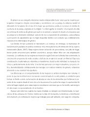 PROCESOS DE EMPODERAMIENTO EN MUJERES RURALES DE DOS MUNICIPIOS DE CHIAPAS 309 El género es una categoría relacional, resulta indispensable hacer notar que las mujeres par- ticipantes rompieron vínculos emocionales y económicos con su pareja; la violencia resultó el detonante de la ruptura. En el caso de la mujer que permanece unida, se reconoce el cambio de conducta de la pareja, originada en la religión. La interrogante se revierte: si la mayoría de ellas son víctimas de violencia de género por qué no se atreven a romper el vínculo y la respuesta que se antoja es la dimensión individual: carecen de ese componente de autoestima, autoconfanza y percepción de capacidades que no logra despuntar debido a un contexto que cotidianamente reproduce los estereotipos de género. Las familias de tipo patriarcal se reproducen a sí mismas; sin embargo, la expectativa de transformación paulatina se podría concentrar en la renovada forma de interacción de las mujeres transicionales (Burin, 2007). Estas mujeres tienen la función de proveedoras, son jefas de hogar, tienen poder emocional pero también económico, aunque deben lidiar con una subjetivación renovada. Los atributos de las mujeres en transición según Burin son la libertad de movimiento, la construcción progresiva de redes sociales y disfrute de un ejercicio sexual con libertad. Bajo esta consideración, la alternativa se vislumbra en transformar, desde la vida individual, la crianza de los chicos y particularmente de las niñas. Si se forman personas con mejor autoestima, con juicio crí- tico, desnaturalizando cotidianamente los mensajes con matices violentos de género, estaremos abonando a una sociedad más igualitaria. Las diferencias en el comportamiento de las mujeres en ambos municipios son notorias. A pesar de que las mestizas temen a la sanción social derivada de su vida pública, se solidarizan para formar un frente común. La formación de alianzas es uno de los elementos que fortalecen la po- sición de las mujeres desde el inicio de su lucha personal, los padres les niegan la oportunidad de volver al hogar original, pero estas mujeres encontraron una mano que se les tendió, casi siempre de otra mujer, excepcionalmente de un hombre. Aunque aún entre las mujeres las manos tendidas no siempre son desinteresadas, la expe- riencia de las artesanas en Oxchuc evidencian la falta de escrúpulos, la tendencia a benefciarse de la buena fe y la confanza de mujeres que trabajan para salir adelante; este rasgo de comporta- Universidad Autónoma de Chiapas