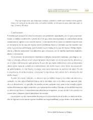 SALUD Y ALIMENTACIÓN EN ADULTOS MAYORES RESIDENTES DE CASAS DE REPOSO 157 “Pues que tenga carne, que tenga sopa, verduras, sus bistecs o todas esas comidas a mí me gustan, bistec y de carne de res me gusta todo, y el cabrito también, es otro que me gusta, pero pues aquí, no hay” (Carmen, 88 años). Conclusiones A medida que avanzan los años las personas van perdiendo capacidades, por lo que progresiva- mente es aislado socialmente y pierde así el rol que antes desempeñaba, lo cual fundamenta las causas para su ingreso a una casa de reposo. En la mayoría de los casos, los adultos mayores que se encuentran en las casa de reposo tienen problemas físicos o mentales que les impiden vivir solos. Las prácticas alimentarias que el adulto mayor realiza en la casa de reposo refejan depen- dencia y falta de autonomía. Los alimentos que consumen con su familia manifestan tradición, afecto y convivencia. En el proceso de alimentación intervienen múltiples elementos materiales, psicológicos, so- ciales y culturales, infuyen en el comportamiento relacionado con el consumo de los alimentos y en el estado nutricional de cada persona. Es por ello que tanto instituciones como profesionales deben poner especial cuidado en la alimentación del adulto mayor como factor de prevención de enfermedades, lo cual traerá, a la larga, una menor demanda de servicios de salud. De ahí la importancia de institucionalizar y promover la importancia del cuidado de la alimentación del adulto mayor. A partir del estudio realizado, se observó que los adultos mayores necesitan más atención y cuidados, no sólo para actividades básicas de la vida diaria, sino se le debe poner especial cuida- do a su alimentación, ya que ellos no pueden comer cualquier cosa, pues se les complica ingerir ciertos alimentos por algún contenido o por prescripción médica. Además, en los adultos mayores se observó que tienen comportamientos alimenticios irregulares, ya que un día o dos pueden no comer bien y después querer alimentarse en exceso. Las mujeres son las responsables de preparar la alimentación de la familia, no obstante el he- cho de ingresar a una casa de reposo modifca esa responsabilidad, ya que dentro de la institución Universidad Autónoma de Chiapas
