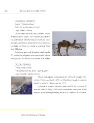 34 JOSÉ ALEJANDRO HERNÁNDEZ MARTÍNEZ NIEVE EN EL DESIERTO Evento: Tormenta Alexa Fecha: 11 de diciembre de 2013 Lugar: Medio Oriente Los territorios de Israel, Siria, Jordania, Líbano, Arabia Saudita y Egipto, con características desérti- cas, aparecieron cubiertos bajo un manto de nieve; escuelas, carreteras y aeropuertos fueron cerrados. La ciudad del Cairo no recibía una nevada desde hace 122 años. Entre los grupos más afectados estuvieron los 2.2 millones de refugiados sirios desplazados hacia el extranjero y 6.5 millones en el interior de la región. CICLÓN DE HIELO Evento: Vórtice Polar Fecha: Diciembre de 2013 – abril de 2014 Lugar: Canadá y Estados Unidos Nueva York registró temperaturas de -12°C; en Chicago, Min- nesota y Minneapolis hasta -30°C; en Manitoba, Canadá, a causa del viento, la sensación térmica fue de -47°C. La tormenta invernal Hércules (enero del 2014), ocasionó 20 muertos, entre 1,700 y 2,000 vuelos comerciales cancelados; 5,000 millones de dólares en pérdidas y afectó a 187 millones de personas. Universidad Autónoma de Chiapas