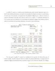 CONDICIONES SOCIODEMOGRÁFICAS 41 Y POBREZA EN CHIAPAS La gráfca 9 muestra un modelo panel completamente unido (pooled regression) para la re- lación entre pobreza alimentaria y la proporción de población indígena municipal. La cual muestra el efecto que el incremento en la proporción de población indígena ejerce sobre los niveles de pobreza alimentaria municipal, para todos los años en su conjunto. El coefciente estimado de 0.12 muestra que un incremento en el porcentaje de población indígena tiene efectos positivos sobre el crecimiento de la pobreza alimentaria municipal a través del tiempo. Tabla 2. Modelo de regresión panel Fuente: Elaboración con base en datos de INEGI, CONEVAL e INEGI Por otra parte, la gráfca 9 muestra los resultados de la regresión de efectos fjos para el mismo modelo, donde la relación entre los niveles de pobreza alimentaria y la proporción de población indígena municipal muestra un cambio de signo en el coefciente estimado, sin embargo Universidad Autónoma de Chiapas