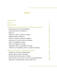 ÍNDICE PRESENTACIÓN 9 PRÓLOGO 11 INTRODUCCIÓN 15 CONDICIONES SOCIODEMOGRÁFICAS Y POBREZA EN CHIAPAS 23 Estructura por edad y sexo de la población 26 Distribución espacial de la población 28 Migración 29 Dinámica demográfca y población indígena 31 Población y pobreza alimentaria 39 Pobreza, marginación y poblaciones indígenas 43 Condiciones de vida de las poblaciones indígenas 46 Pobreza y desigualdad en Chiapas 49 Pobreza y marginación en Chiapas 53 Desigualdad y pobreza en municipios de Chiapas 57 Condiciones de desigualdad y pobreza en poblaciones indígenas 58 MORTALIDAD INFANTIL Y POBREZA EN CHIAPAS 63 Análisis de los niveles de mortalidad infantil 66 Identifcación de variables contextuales 72 Mortalidad infantil en municipios de Chiapas 73 Niveles de pobreza alimentaria y su efecto en la mortalidad infantil 85 Análisis de la mortalidad infantil y la pobreza alimentaria 88