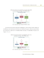 MORTALIDAD INFANTIL Y POBREZA EN CHIAPAS 81 Gráfca 24. Evolución de los indicadores de pobreza alimentaria en los municipios de Chiapas, 1990, 2000 y 2010 Fuente: Elaboración propia con datos de CONEVAL e INEGI. Los indicadores de pobreza alimentaria desagregados a nivel municipal muestran algunas de las diferencias más importantes en términos de su distribución espacial, además de que permiten geo-referenciar los patrones de mortalidad infantil municipal y la desigualdad de ingresos (ver mapas 9, 10 y 11). Gráfca 25. Evolución del índice de desigualdad de Gini en los municipios de Chiapas, 1990, 2000 y 2010 Fuente: Elaboración propia con datos de CONEVAL e INEGI. Universidad Autónoma de Chiapas