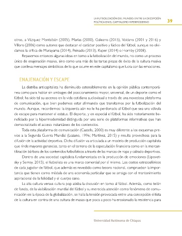 Villoro (2006) como autores que destacan el carácter positivo y lúdico del fútbol, aunque no olvi-